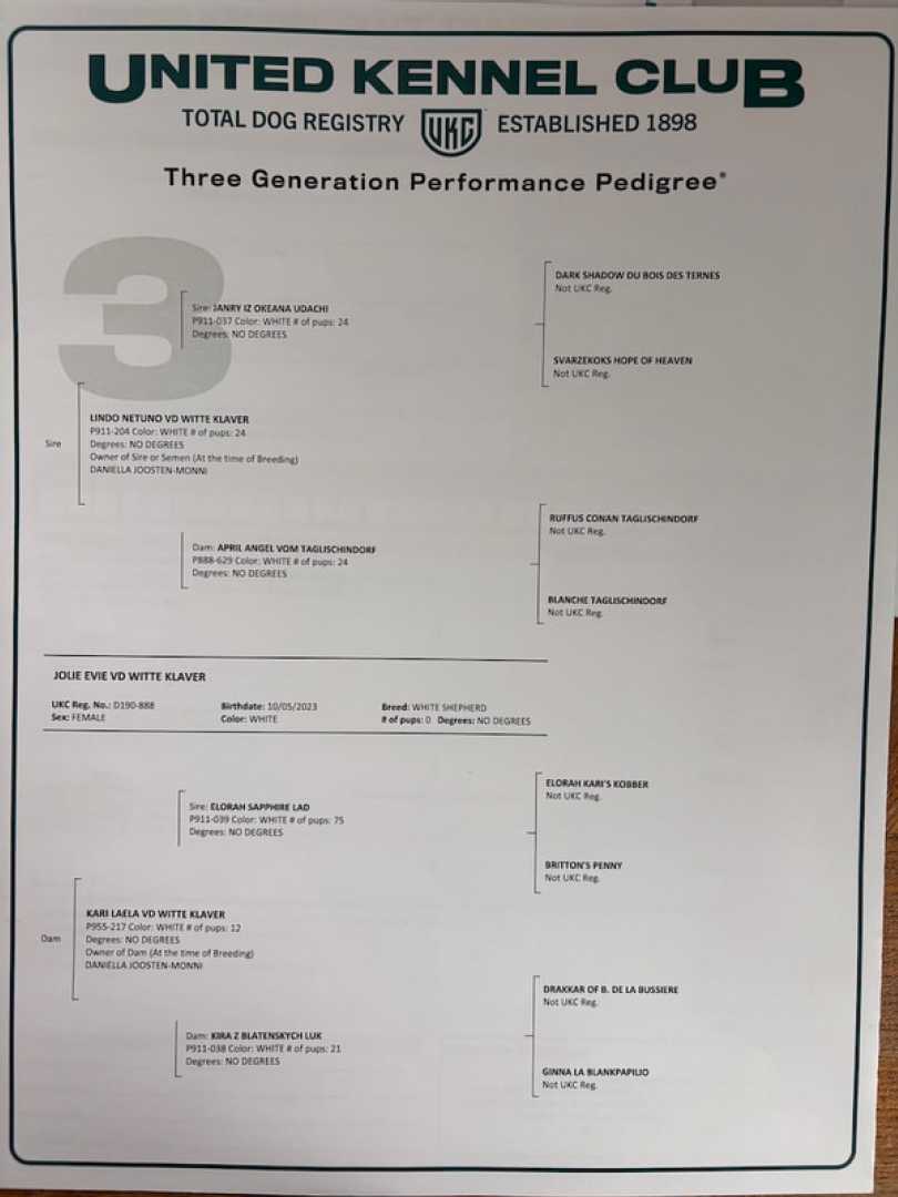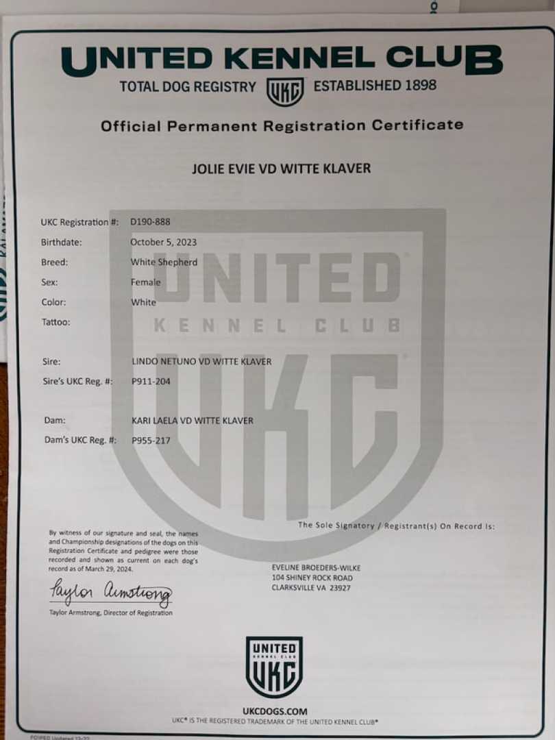 Evie her parents are both White Swiss Shepherds registered in the Dutch department of the FCI, but for some reason her breeder decided not to register their litter with the FCI, but only with the UKC. I had hoped to register her myself once her ownership was transferred, but that wasn't the case because they told me she was too young when she left The Netherlands.