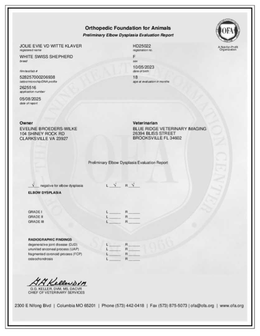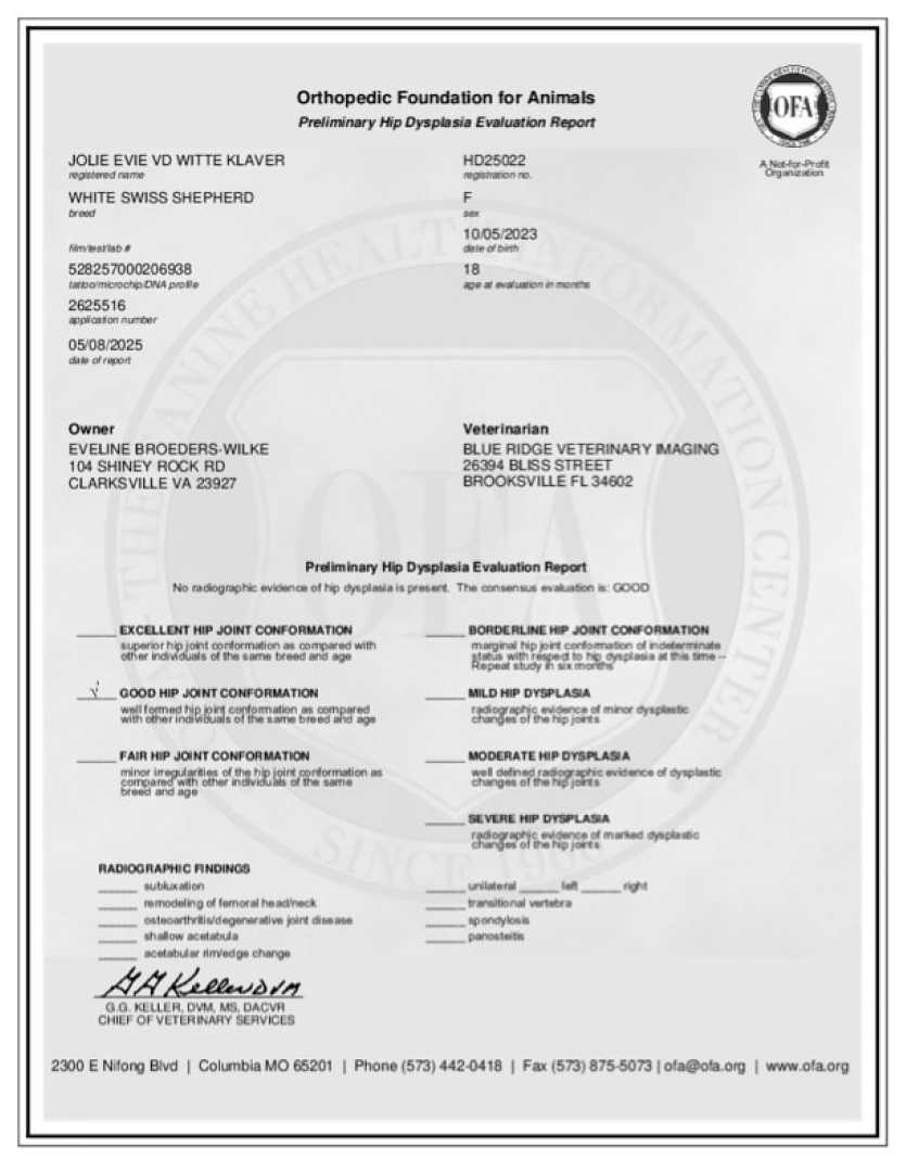 Yeah!!! Evie has no dysplasia! Got her OFA results in today and I am very happy with the result. Another step closer to breeding with her this Fall.