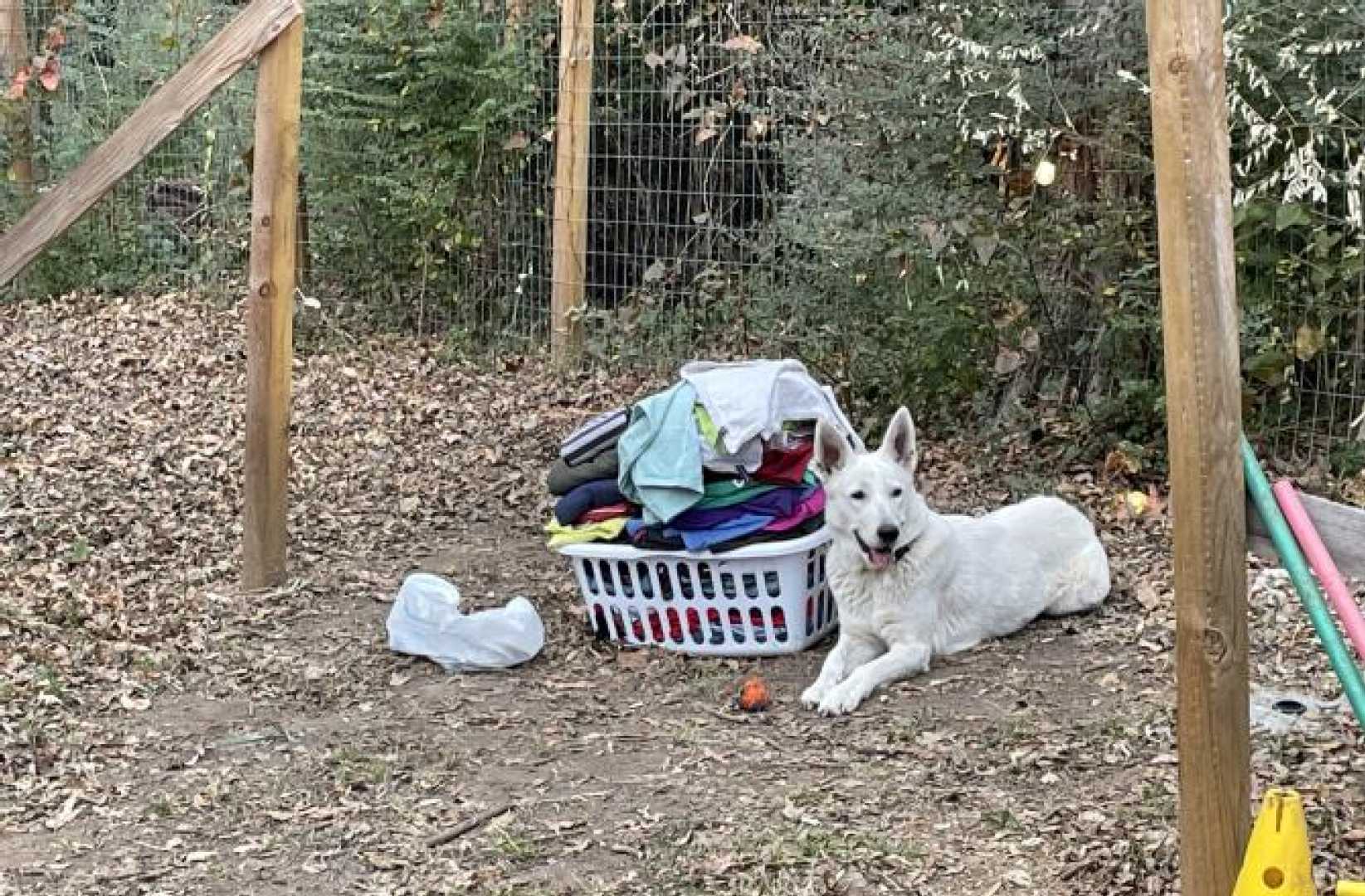When I hang up the laundry outside in the Dog Pen I always take Jessie with me. She wants to play fetch while I am hanging up the laundry. And although it takes more time for me to finish I love having this 'alone time' with her.
