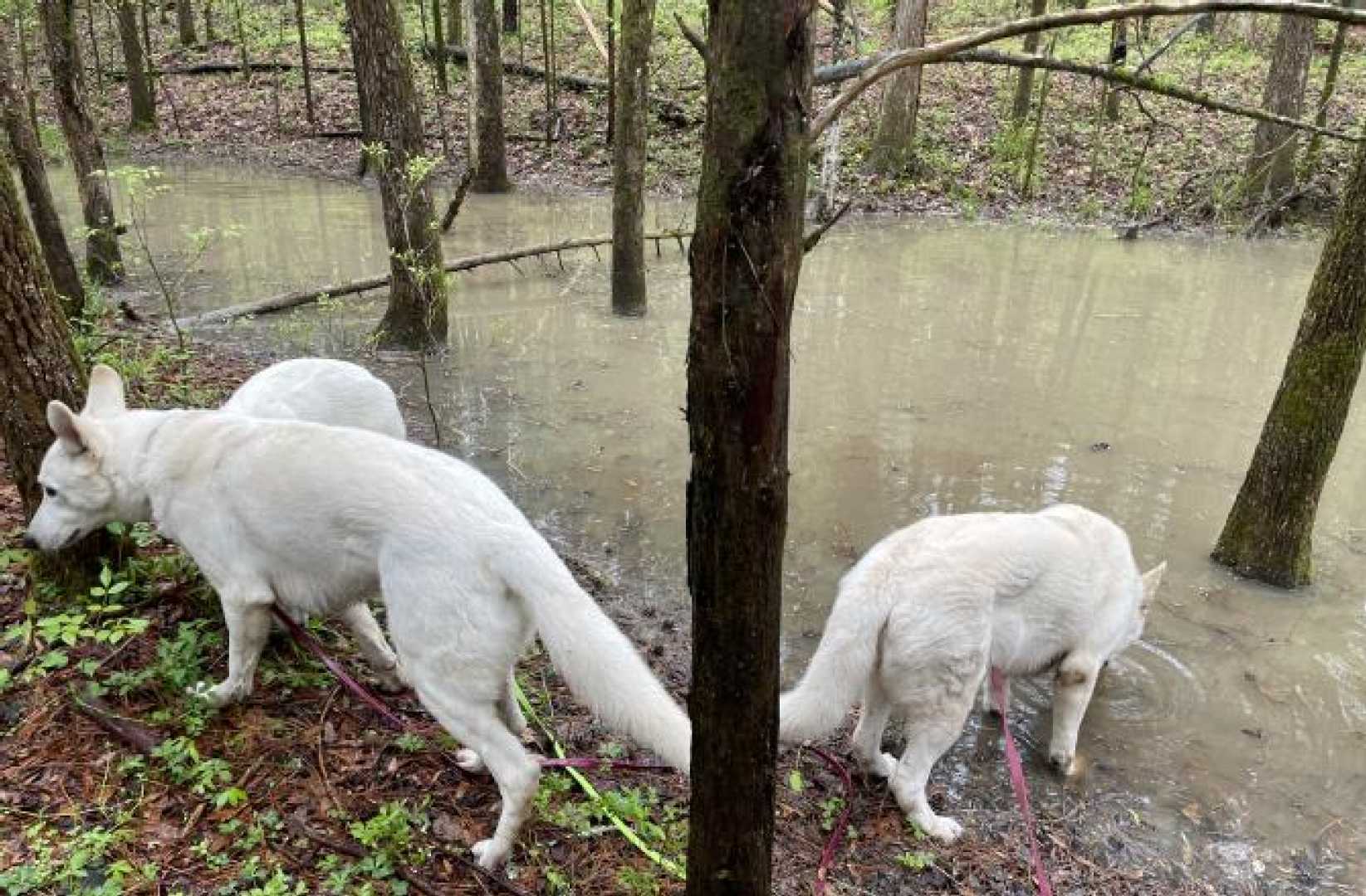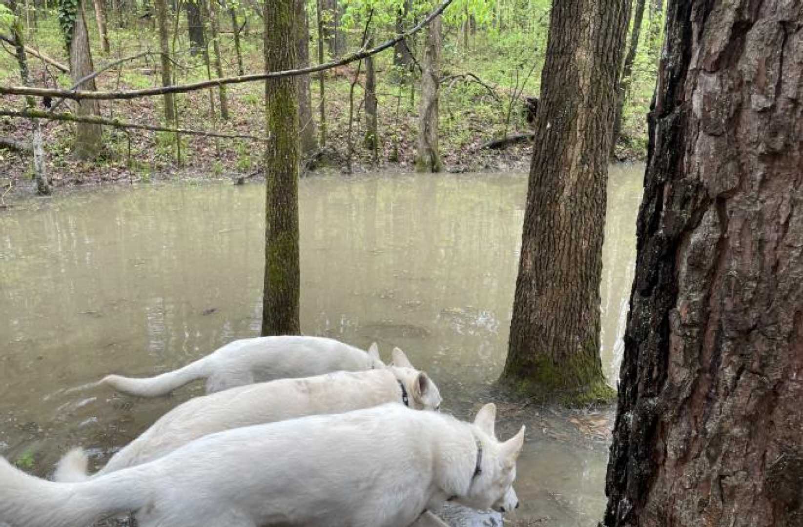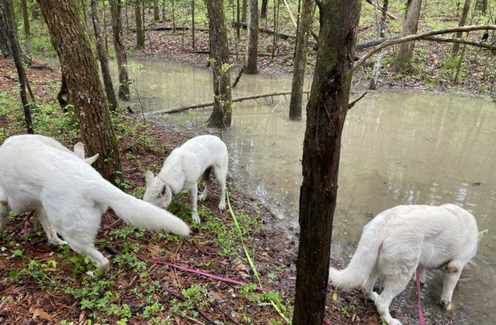 In the weekend there is no training for the dogs and we walk them together during lunch. Because of Tick season their walks through the wood is kept short. So yesterday, after havibg fun time in the Dog Pen we all went to the Pond. They love it especially drinking from it after a good rain fall like the that was the case the night before.
