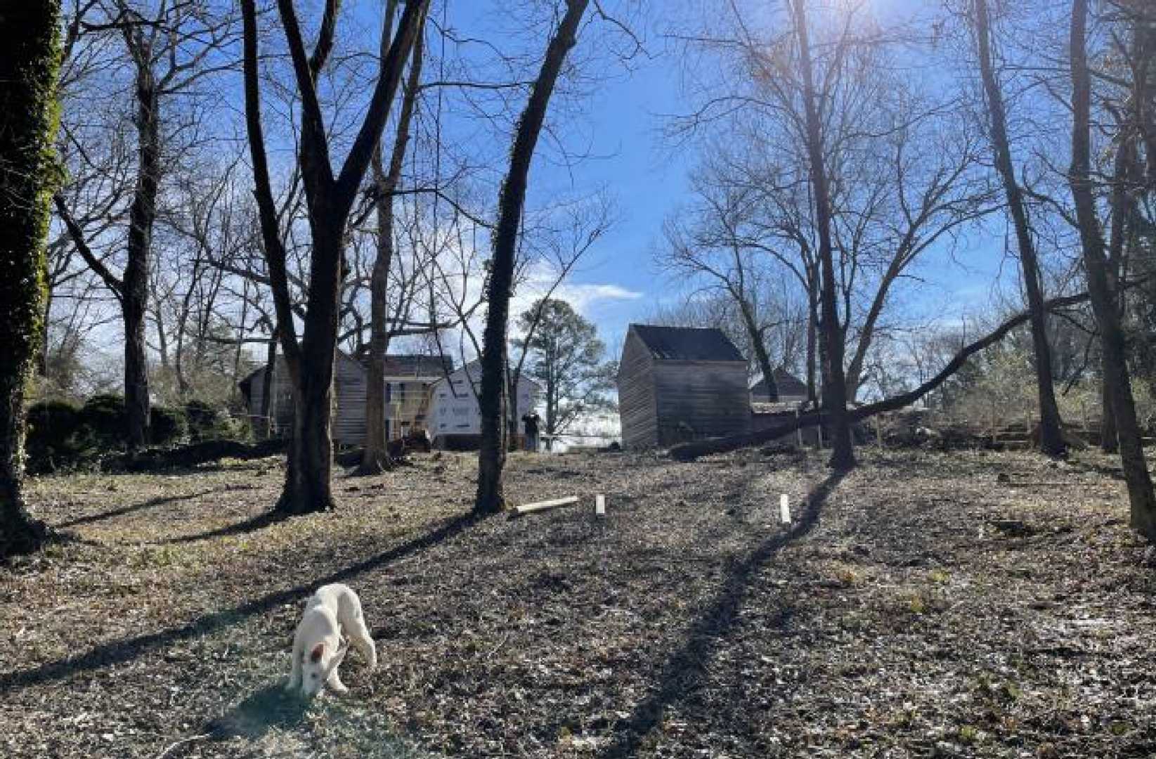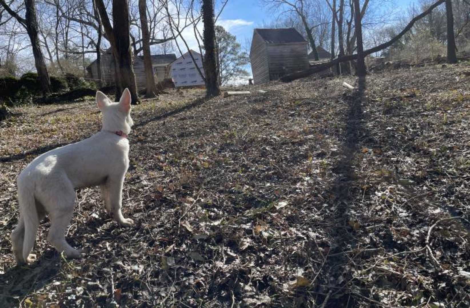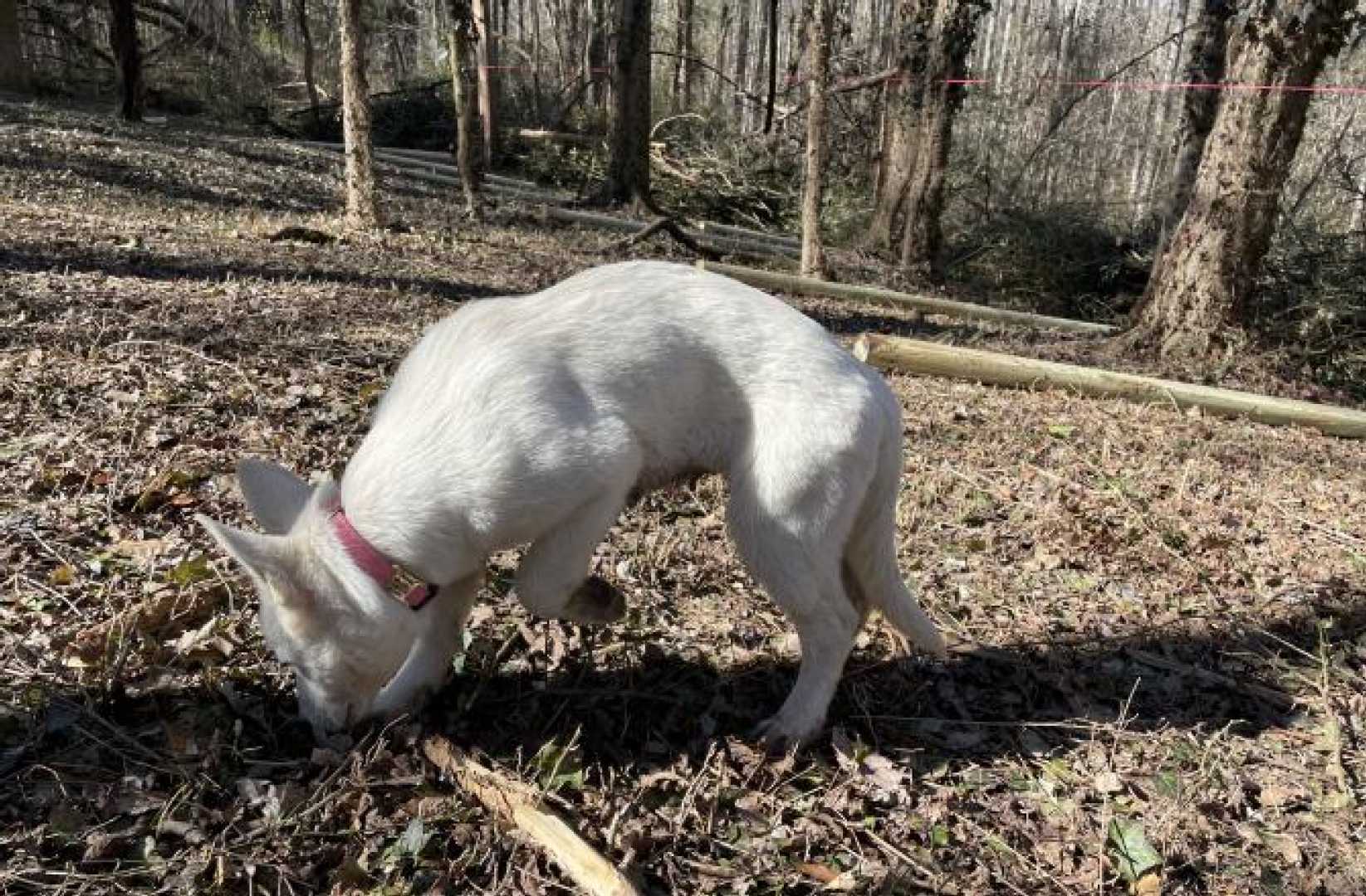 We are working on the dog pen. First we were busy clearing the peace of property we decided to be a dog pen, then we had to make holes with a Auger, so that is what we started on yesterday. Together with Jessie I layed out all the posts while Martijn was carrying the post down the hill. Jessie kept close to us, so thats good. However today, when Martijn used the gas bushtrimmer, she was startled and scared. But it is a start and i am very satisfied it went so well.
