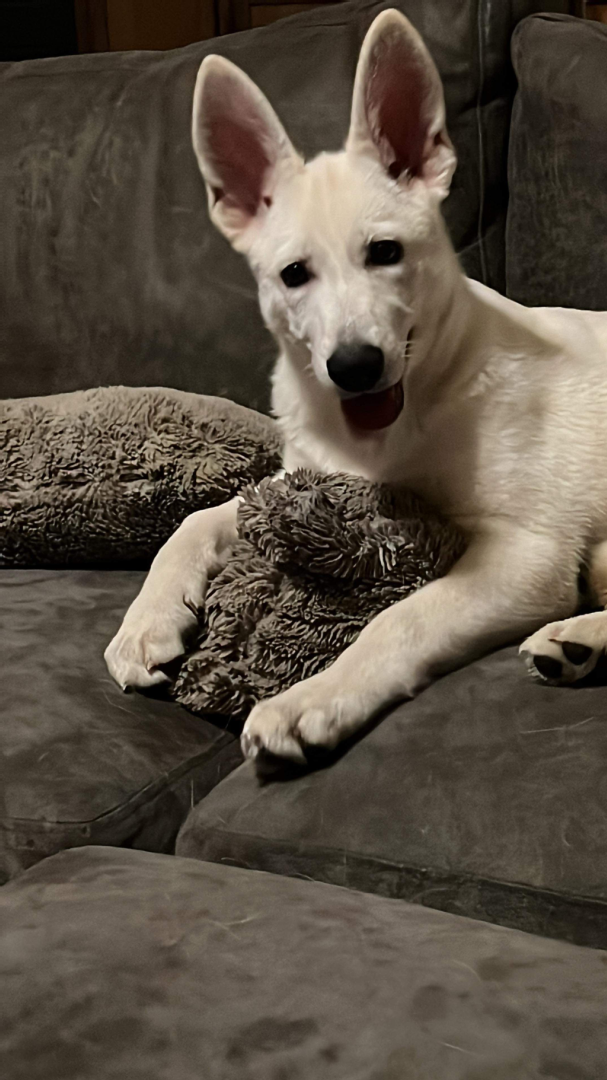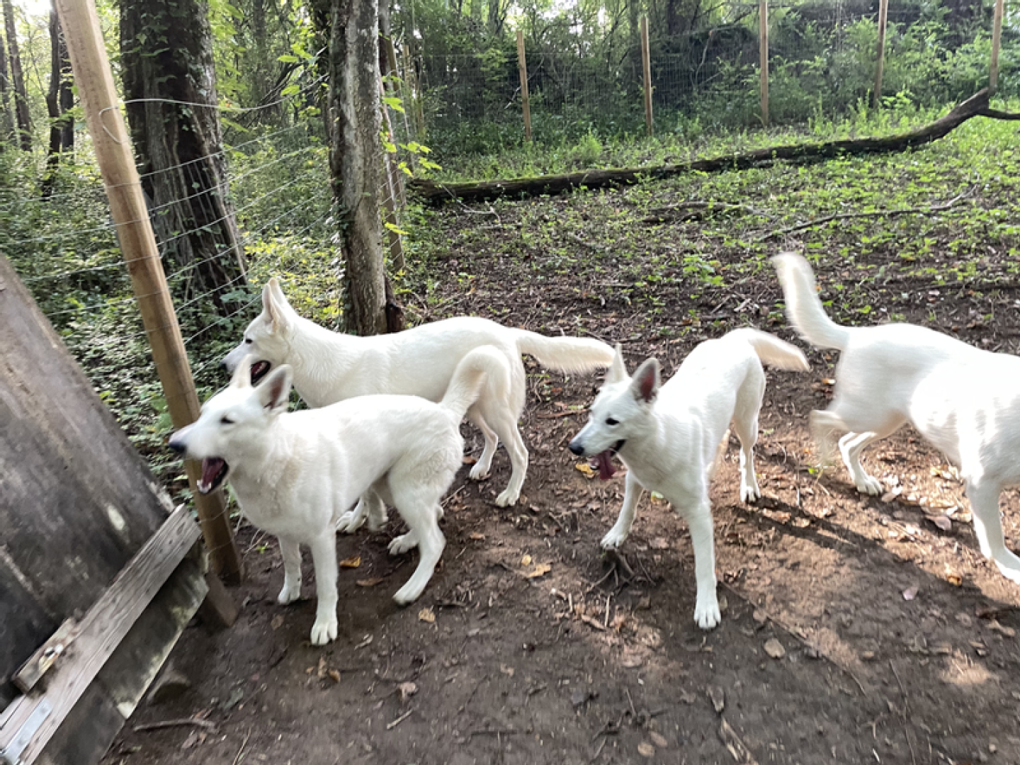 So I started to throw the ball over the fence of the dog pen, yell 'find' and then opened the door so that they could go look for it. Of course they can see the direction of where the ball is falling, but because they can't see the difference between the colors orange (ball) and green (grass and bushes), they have to use their noses big time. And because we live on top of a hill they have to run up and down the hill, what drains their energy so much. After finding the ball they come back in the pen and bring me the balls. That's how I came up with the name FITCH (FInd + feTCH).