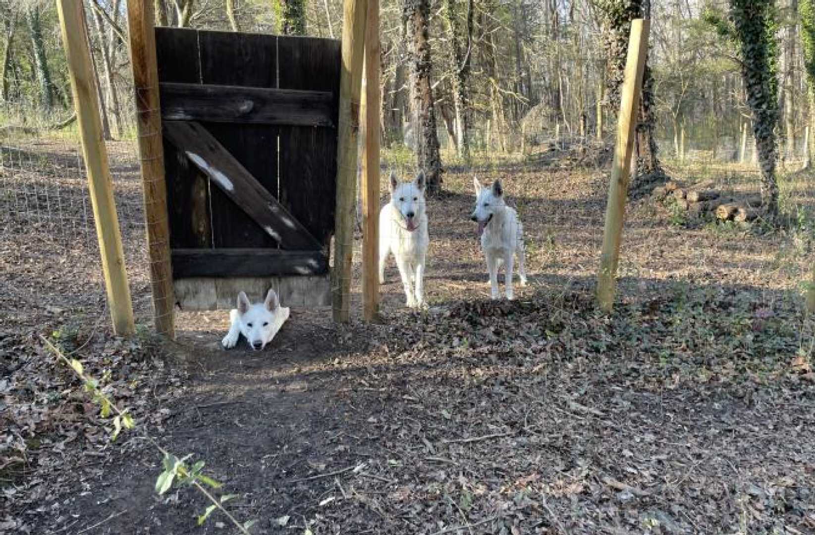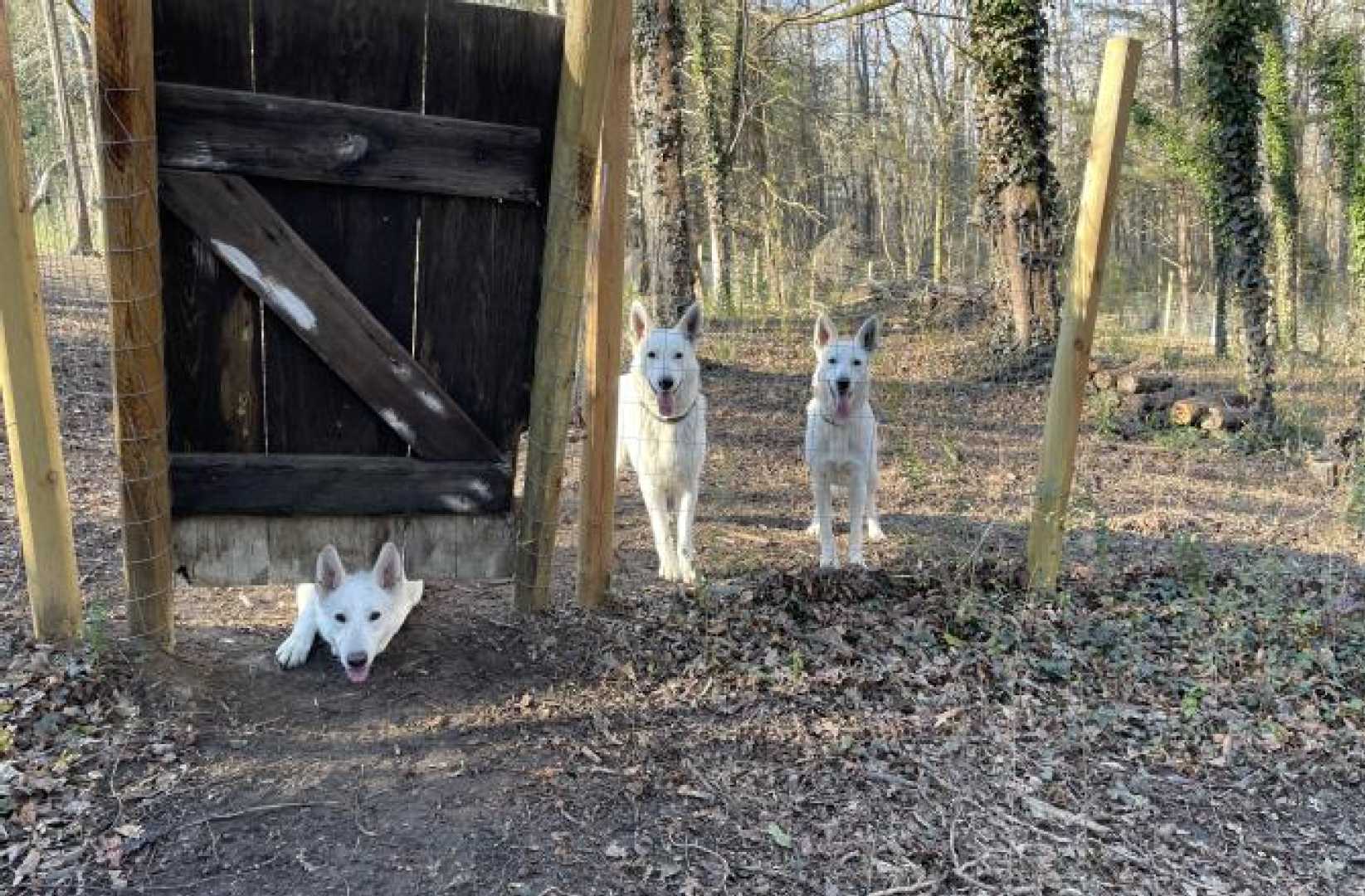 Mojo, Mijne and Jessie love to fetch a ball. So I came up with a game called 'seek the ball'. I throw two balls over the fence of the dog pen, into the wood and then open the door when giving the cue 'seek'. Sometimes they find both balls in seconds, sometimes it takes minutes. We play this game like 15-20 minutes every time we go out to the pen and they really love it and drains their energy. Jane is to young to join bc of her joints. It happens sometimes that i throw the ball in the middle of a big stack of wood. To make sure that they don't hurt themselves i leave then in the Pen and go fetch the ball myself. The picture shows them waiting for me and Mijne is the one with his head shoved under the door LOL.