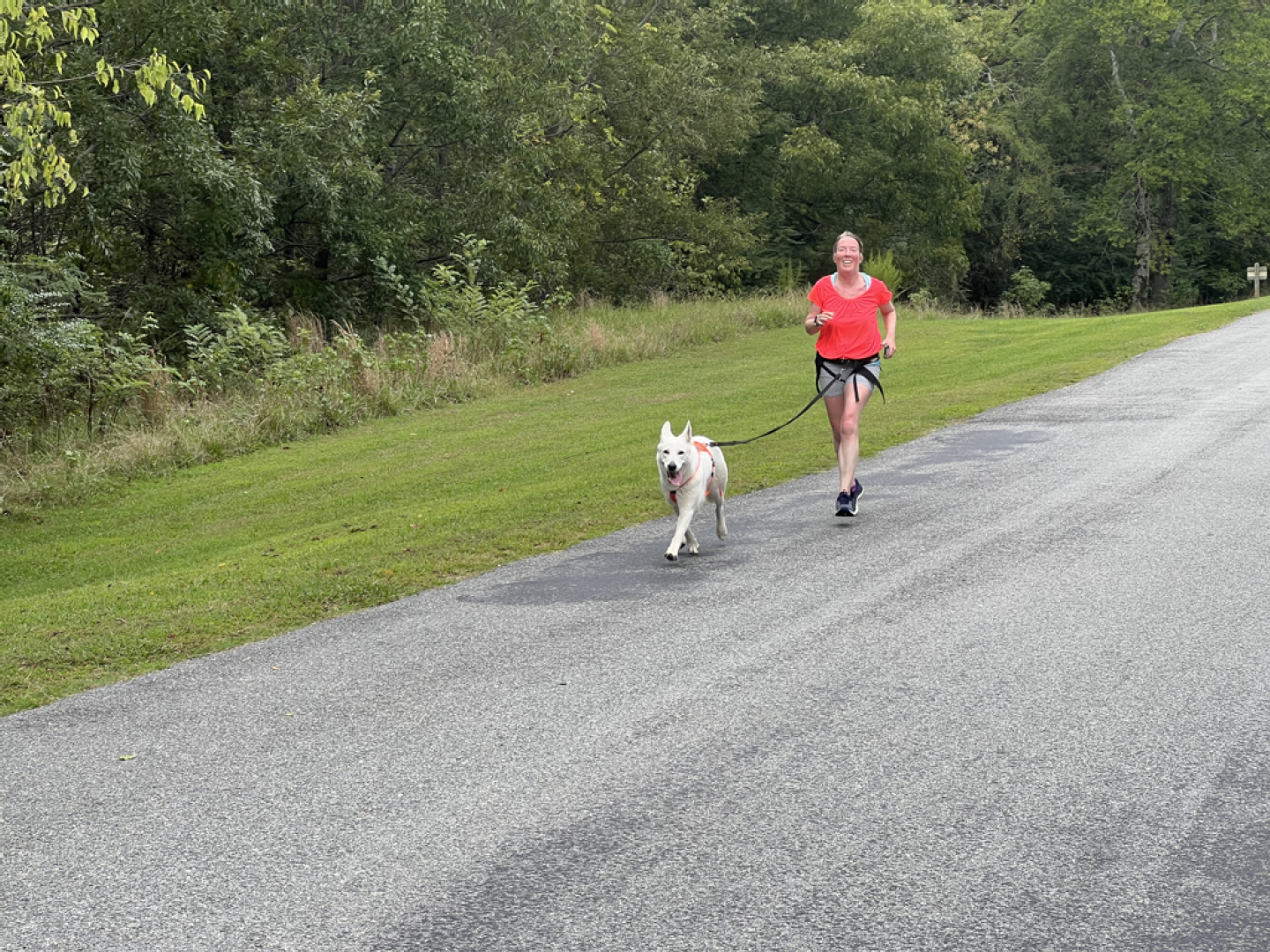 In The Netherlands I always used to run with the dogs. I don’t know how many miles I ran with Mullet our previous dog, but with 3 times a week at least 5k per time and for at least 10 years, it must at least been 7500k (appr 4700 miles). Because Mullet got old and his sight decreased, we stopped running together. And because I had to wait with Mojo until he was around one year before I could start, for 2 years I ran alone. But with Mojo I started again and when Mijne was old enough, he too was part of the running team. With those two strong dogs I didn’t run, but it felt like flying. Or more like ‘water skiing’. And then Jessie came along, and Jane. So I stopped running with the dogs, but again now that they are old enough I am picking it up again. First with Jessie, she is very easy to handle. Mojo I will take next time, together with Jessie. And when we get the hang of it I will take Jane also.