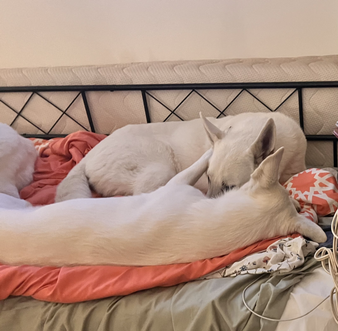 And then you don’t live in a big city and forget all about training your new puppy to get used to walk with a collar and with a harnass. When we lived in The Netherlands we walked and run with Mojo and later also Mijne, in the city, in parks, woods and on the beach. So we learned them to walk with a collar but also with different kind of harnasses, with long leashes, or short, bungee leashes, etc etc. And then one day, so that was yesterday I realized that I forgot to get Jane use to wearing a harnass. And because she loves to run, she’s really fast, I want to train her to go running with me. Maybe even some carni-cross. So today I put on a (old Mijne) harnass on her and after a minute or so she got used to it. So I guess this hurdle is taken and hopefully as of next week we can start training. Btw, because of risk of elbow and hip dysplasia which can also occur when there is to much or mis exercise during a young age, it’s adviced not to start before one year old with running, agility, etc. And even then, these WSS grow untill around 2 years old so untill then caution is adviced.