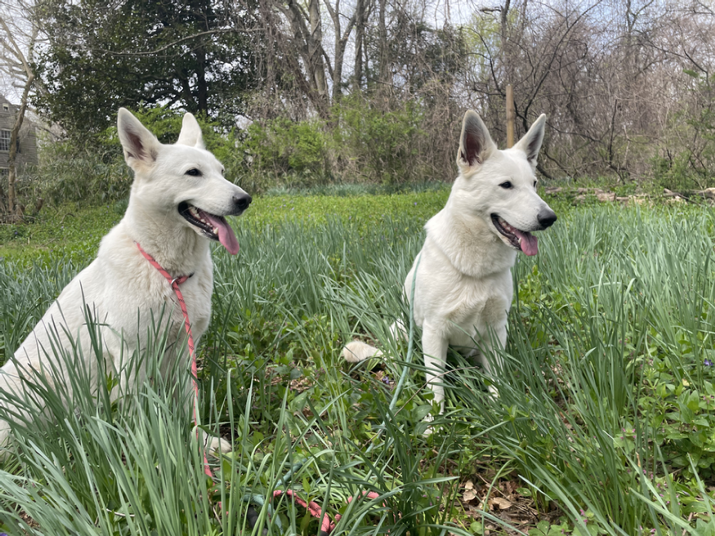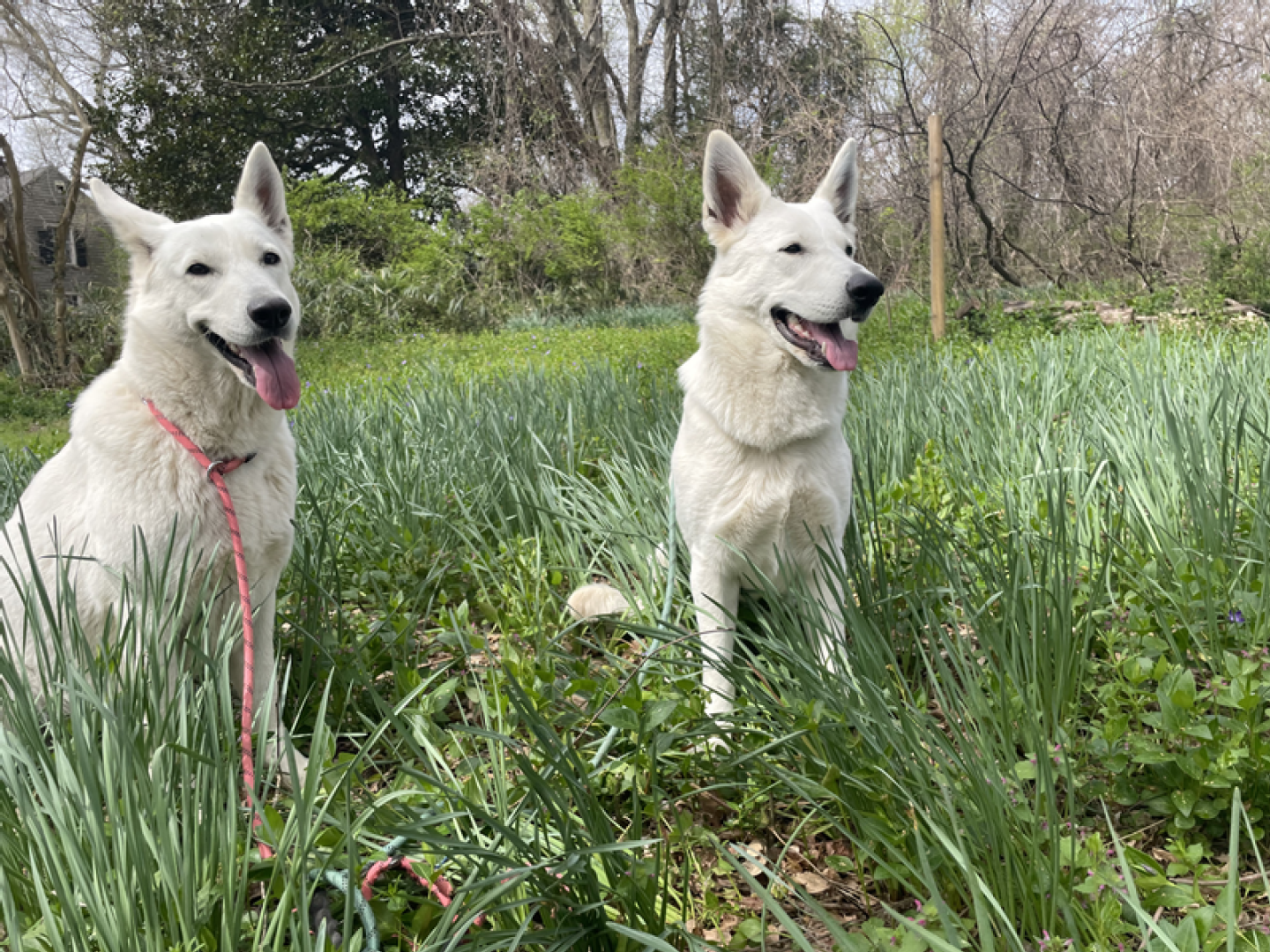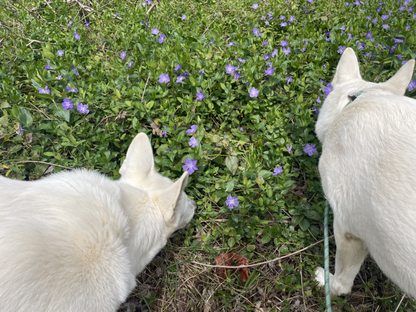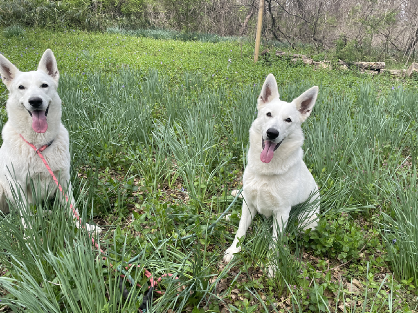 I love this time of the year when all comes in bloom again, the days are getting longer and warmer. Spring also means new life: birds lay eggs, seeds germinate and lambs are born. Here on Sunnyside we have to wait a little bit more before we can welcome Jessies puppies (we are almost 100% certain she is pregnant) and in the meanwhile we enjoy this new season. Because Jane went in heat this week it’s again the girls versus the boys and so I made some pictures of the girls during our walk today. Jessie is Miss Pink & Jane Miss Teal.