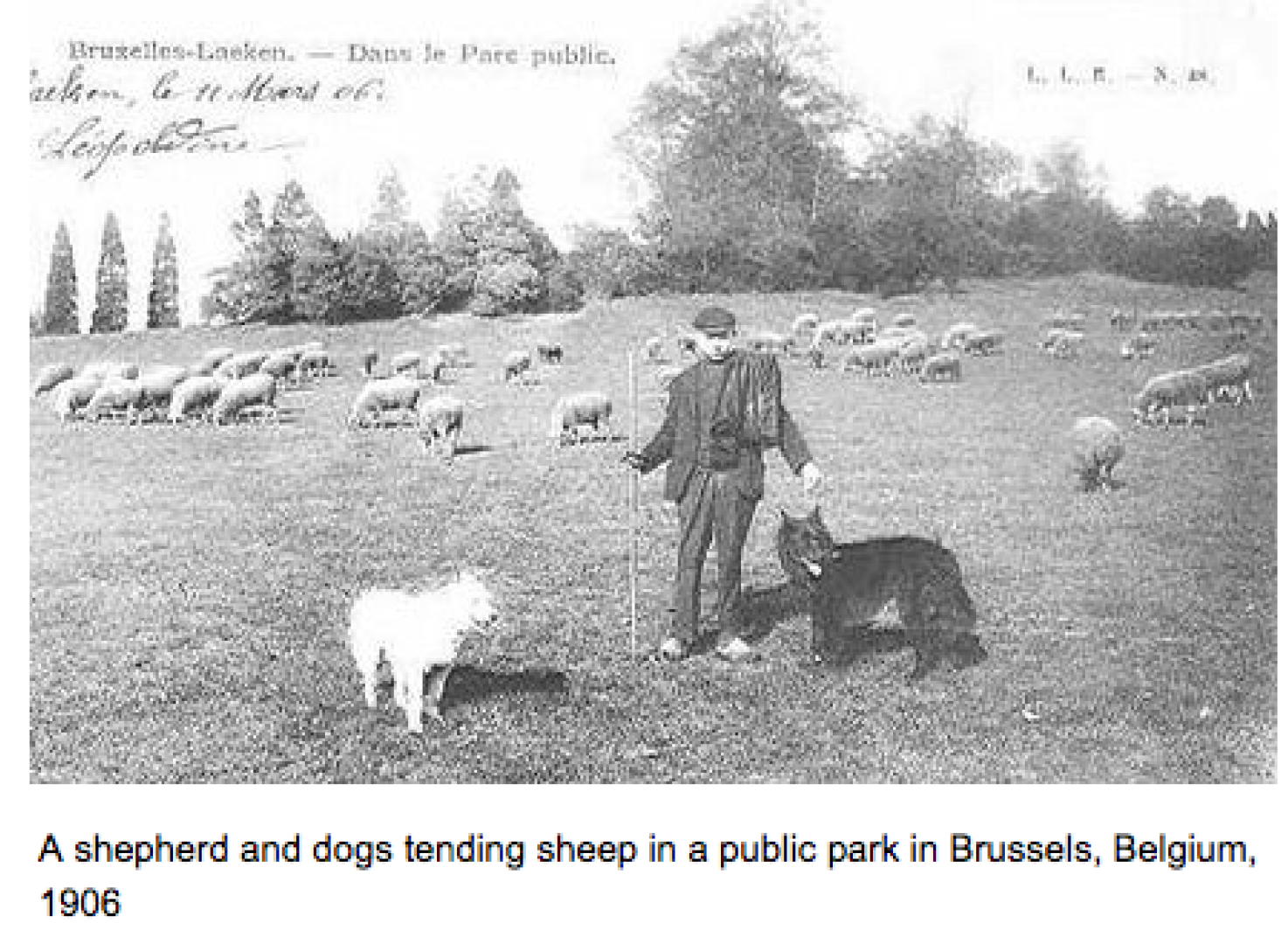 However the White Swiss Shepherds are like their common ancestors the German Shepherd Dog working dogs developed originally for herding and guarding sheep. And to proof this I found this 1906 cool post card of a public park down in Bruxelles-Laeken with a White Shepherd Dog!!!