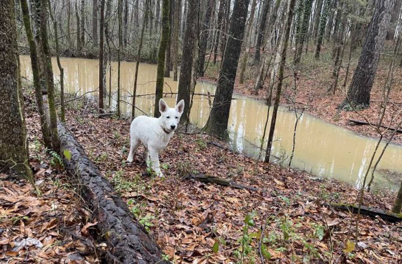 So this morning I took the gang out to the pond here on our property. First they were all leashed but because of the narrow path to the pond, I decided to let Jessie of leash. But before I knew it she jumped right in the middle of the pond. So now she is all wet and yakkie😝. Not nice, especially because we have to go to Henderson NC this morning and Jessie still travels sitting on my lap😱